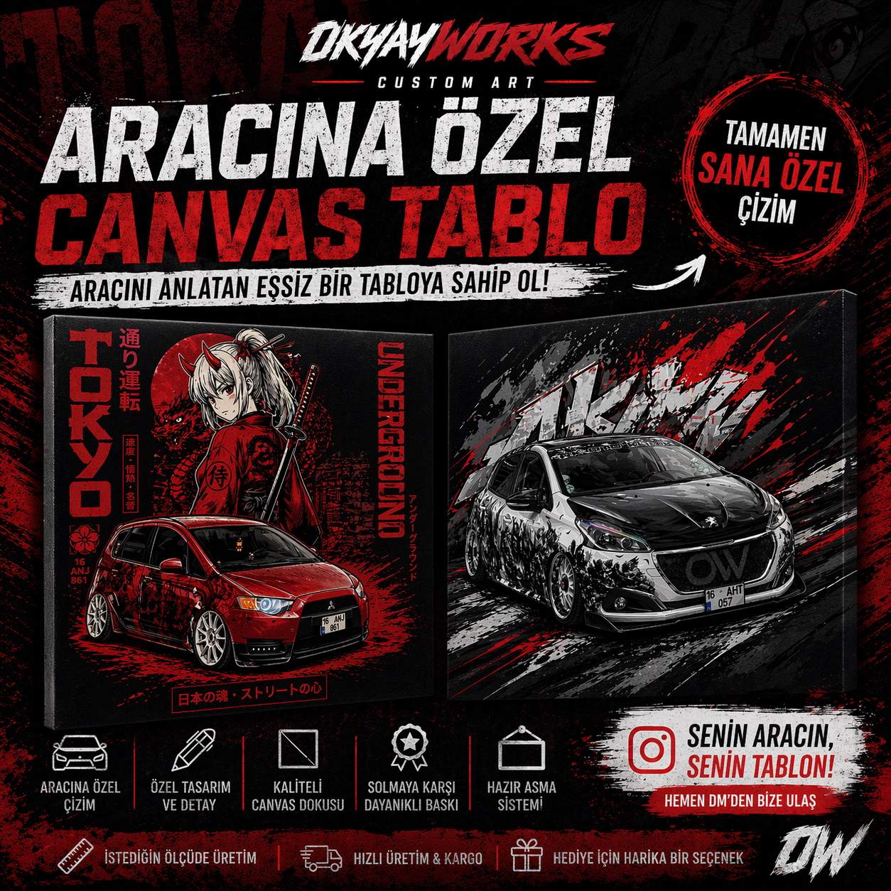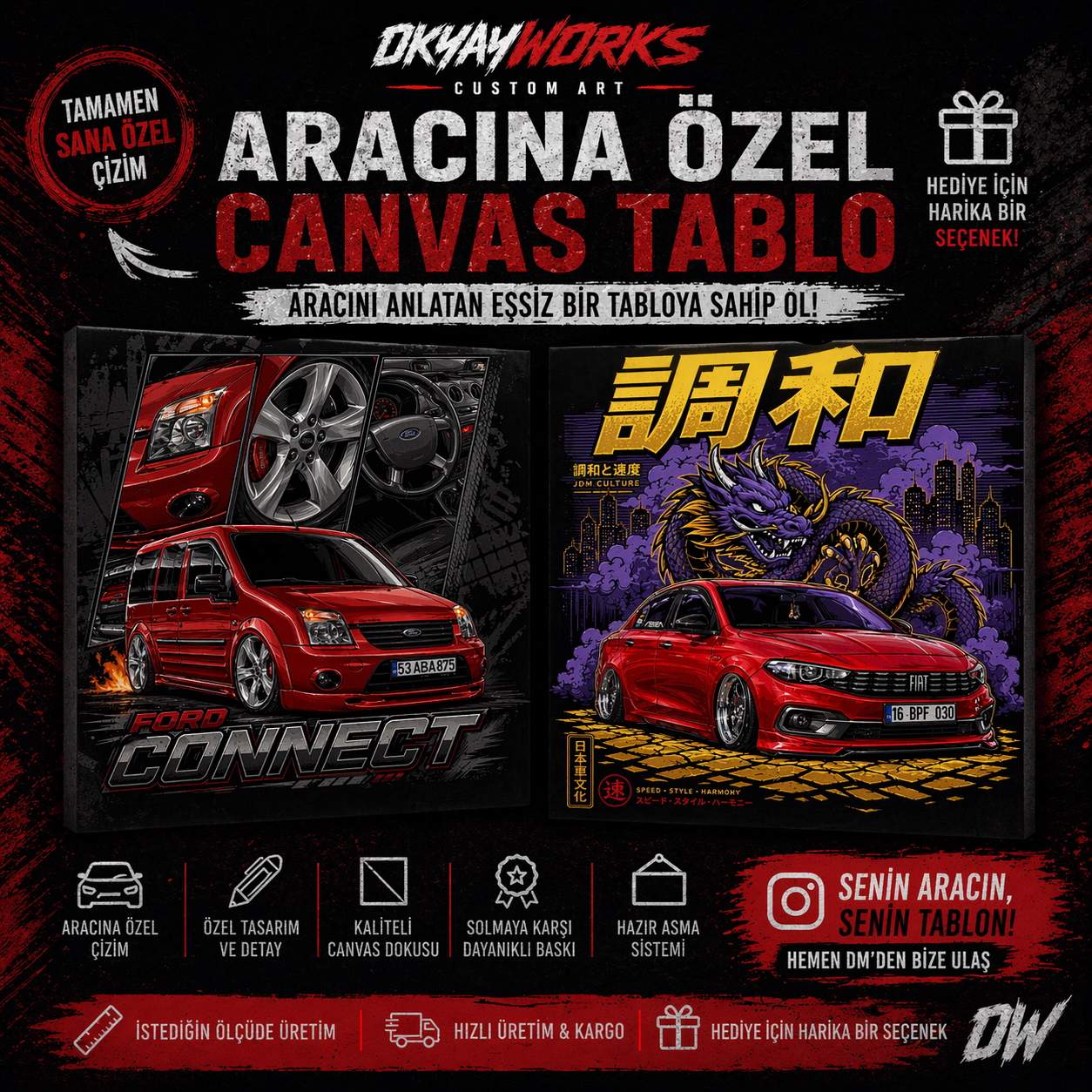 Aracını sıradan bir fotoğraftan çıkarıp sanatsal bir esere dönüştürmek ister misin? Okyay Works imzasıyla hazırlanan kişiye özel canvas tablolar, aracının karakterini ve tarzını en etkileyici şekilde duvarına taşıyor.